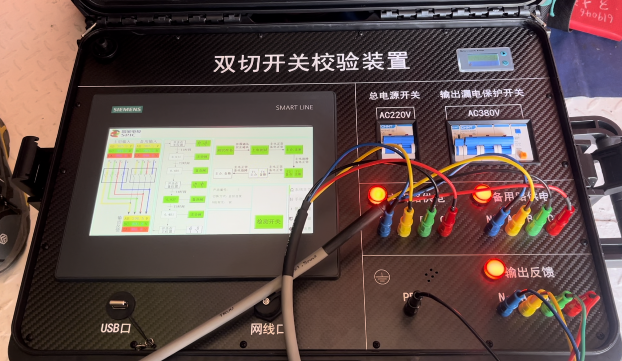该发明双电源切换开关校验装置包括主回路、副回路、电压变送系统、控制系统和显示系统,且自带电源系统,通过调节开关实现对双电源切换开关的功能校验,无需等待主备用电源窗口期,可一键自动完成双切开关所有模式下的动作测试,同时能够精准测量主备用切换时间,安全高效完成功能校验。该技术方案不仅操作方便,而且精确度高,效率高,为安全高效完成双切开关的功能校验提供了可靠的技术支持,可广泛应用于高层建筑、小区、医院、机场、码头、消防、化工、核电站等这种不允许停电的重要场所。
