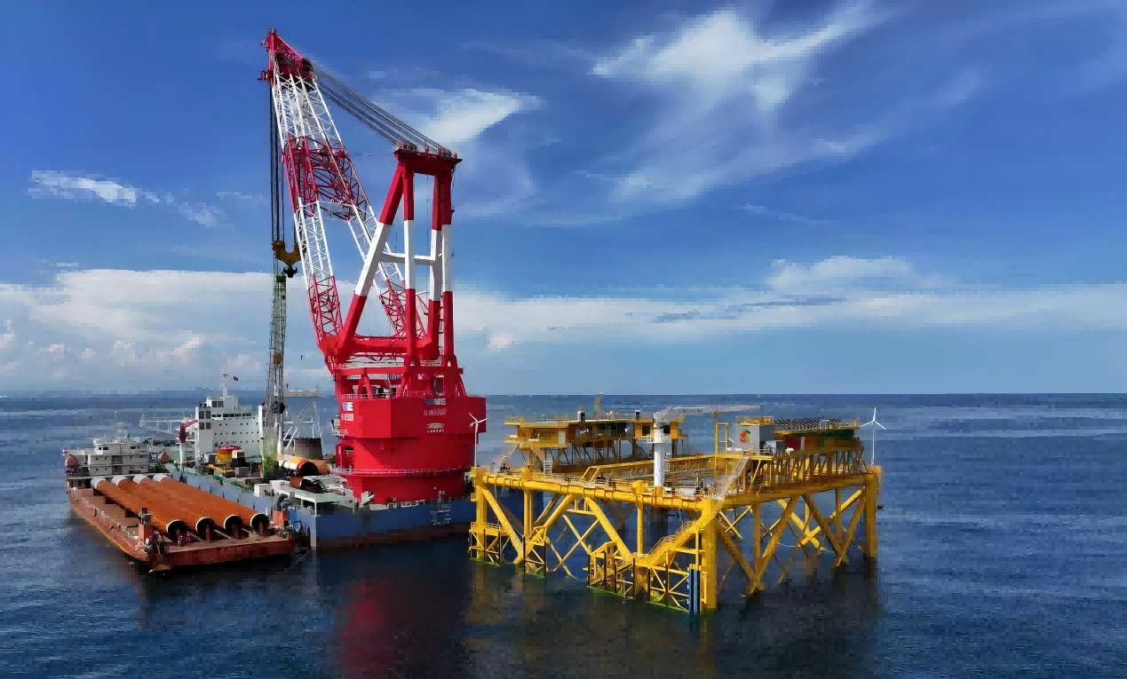 在面临场址水深涌急、施工窗口期短、施工船舶选型苛刻、吊装工况要求极高等诸多挑战,为确保施工顺利进行,sunbet申愽官网广东公司联合国核电力院项目团队紧盯台风过境后黄金窗口期,严把进场船机、人员安全关,通过半潜驳船与浮吊船联合作业,气囊助浮完成网箱沉放,并完成后续钢管桩沉桩、灌浆等施工,将“龙宫号”安全平稳安装到指定位置。