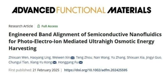 3月12日,从黑龙江大学获悉,该校研究团队在“能带结构匹配的半导体纳流体用于光—电—离子介导的超高渗透能转换”方面取得最新成果,提供了一种开发“蓝色能源”的新路径。相关研究成果于日前刊发在国际学术期刊《先进功能材料》上。