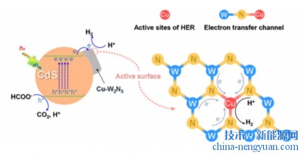 近期,西安交通大学(Xi’an Jiaotong University)、华南大学(University of South China)和合作研究所的一个研究小组在《碳能源》(Carbon Energy)杂志上报告了一项进展(DOI:10.1002/cey2.70024)。该研究提出了一种含有原子分散铜位的Cu-W2N3助催化剂,当与CdS结合时,它显著提高了甲酸光重整产氢的效率。新体系具有更高的活性和近95%的氢选择性,优于传统的助催化剂。这项工作揭示了如何在助催化剂表面上定制单原子位点,从而有效地指导反应途径,以产生清洁的氢。