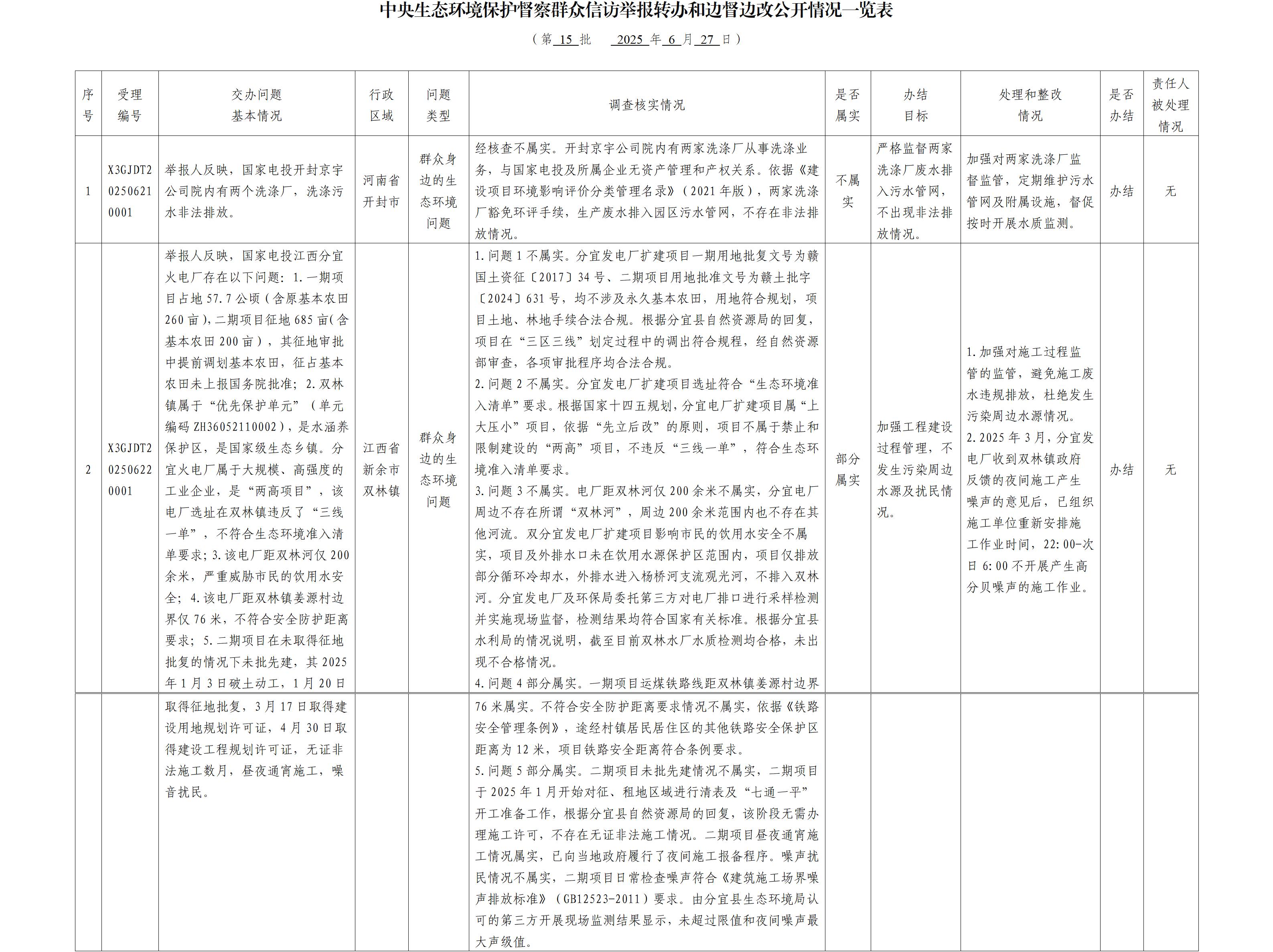 中央生态环境保护督察群众信访举报转办和边督边改公开情况一览表(第十五批)