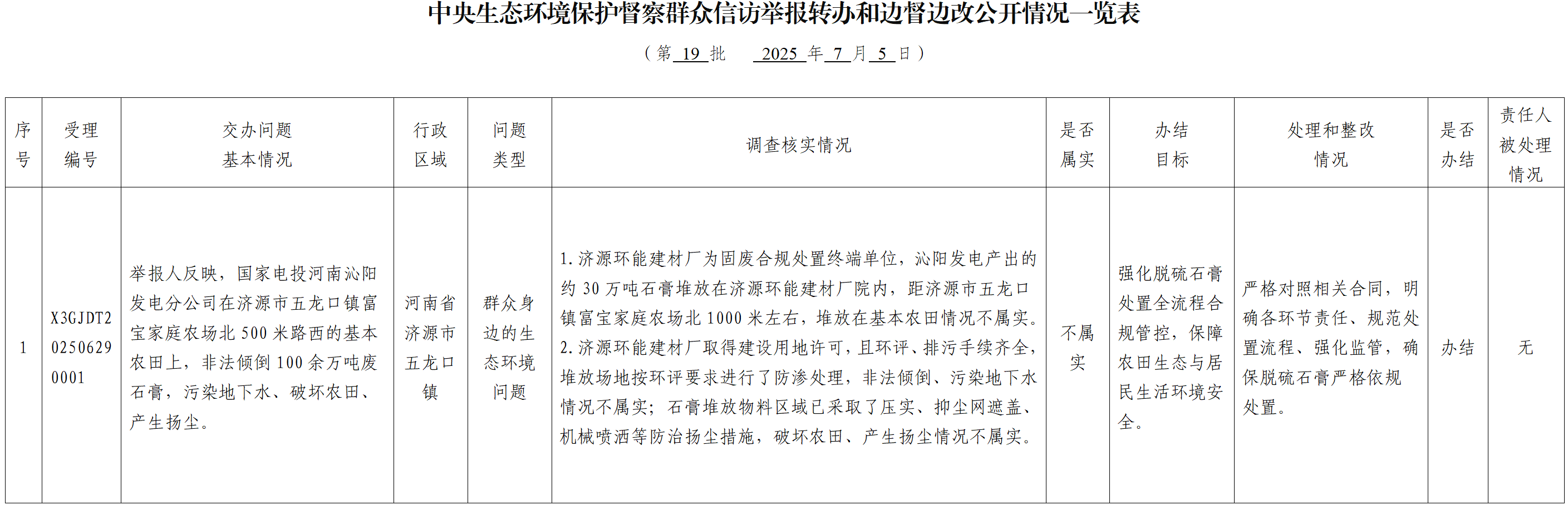 中央生态环境保护督察群众信访举报转办和边督边改公开情况一览表(第十九批)